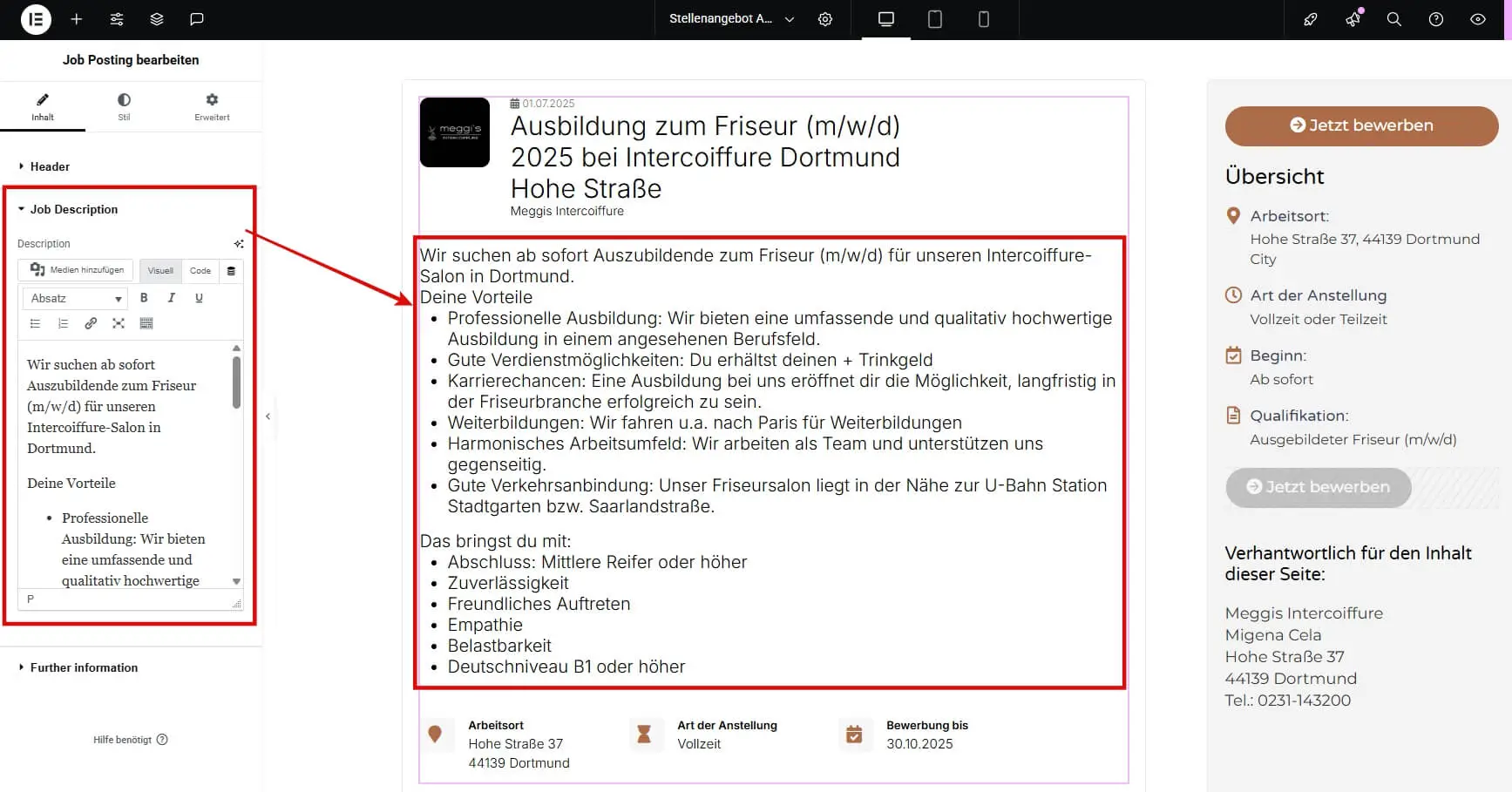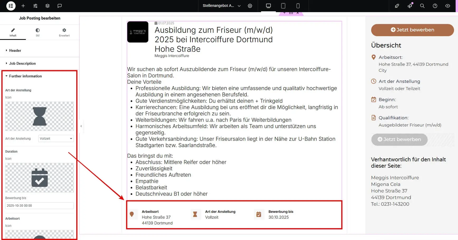 Ganz im Gegenteil! Das Widget funktioniert genauso einfach wie alle anderen Elementor Widgets. Du ziehst es einfach per Drag-and-drop auf deine Seite und gibst die Jobdetails in die entsprechenden Felder (Titel, Beschreibung, Standort usw.) ein – das Widget bietet zudem die Style und Design-Möglichkeiten, die auch von anderen Elementor-Widgets gewohnt bist